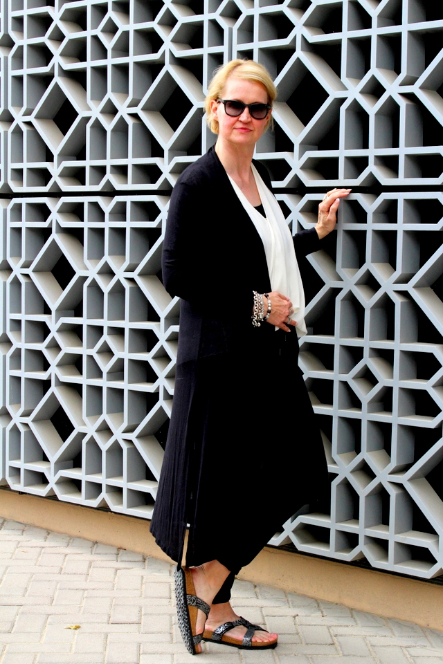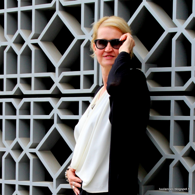 Asukriisin iskiessä onko helpompaa juttua kun mustavalkoinen. Ainakin tämä combo toimii aina. Tuttua ja turvallista! Mielestäni juuri tässä kokonaisuudessa ovat mukana kaikki hyvät peruselementit. Nämä kuvat on otettu matkalla mutta käytän tätä kokonaisuutta todella paljon; Valkoinen siisti silkkipaitis, mustat perusnyörihousut ja pitkä ohut neuletakki. Matkavaatteena varsinkin musta toimii hyvin. En tiedä onko siellä ruudun takana muita samanlaisia kuin minä, jolle aina sattuu ja tapahtuu matkustaessa varsinkin ruuan kanssa. Ikimuistoinen juttu on takeaway kahvit sylissä matkalla golfkilpailuun. Siinä tilanteessa ei auttanut muuta kuin ajaa metsätielle vaihtamaan housuja. Onneksi oli varapöksyt mukana.