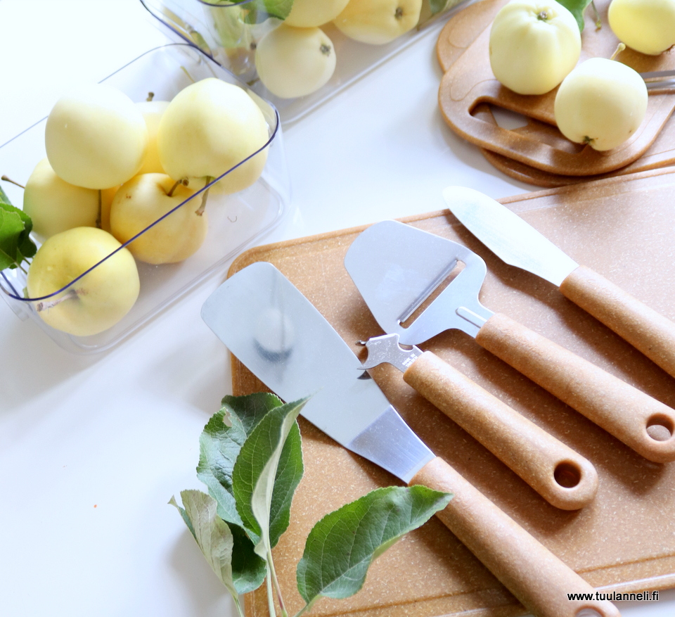 Meidän omenapuut ovat jälleen tänä vuonna notkuneet satoa. Olemme useana iltana tehneet erilaisia omenaherkkuja. Tänään jaan teille pari suosikkireseptiä. Samalla vinkkaan todella ihastuttavasta kotimaisesta Orthexin GastroMax Bio-keittiövälinesarjasta. Nämä kauniit biomuoviset leikkuulaudat ja työvälineet ovat ainutlaatuinen yhdistelmä sokeriruokoa ja pohjoismaista puukuitua.