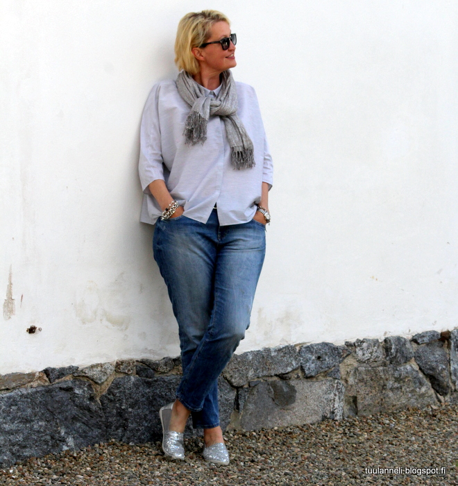 grey shirt//COS, jeans//Lindex, scarf//Tiger of Sweden, shoes//Vagabond
